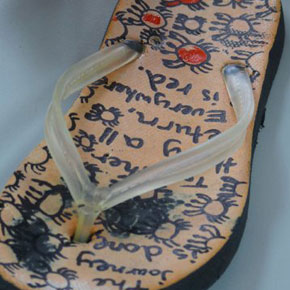 For ‘Thonglines’ we focused on haiku-inspired poetry because haiku often depicts nature, so it seemed fitting to the context of a tropical island. Our medium, writing and painting on thongs, also had the inadvertent benefit of helping to clean up our local beaches!