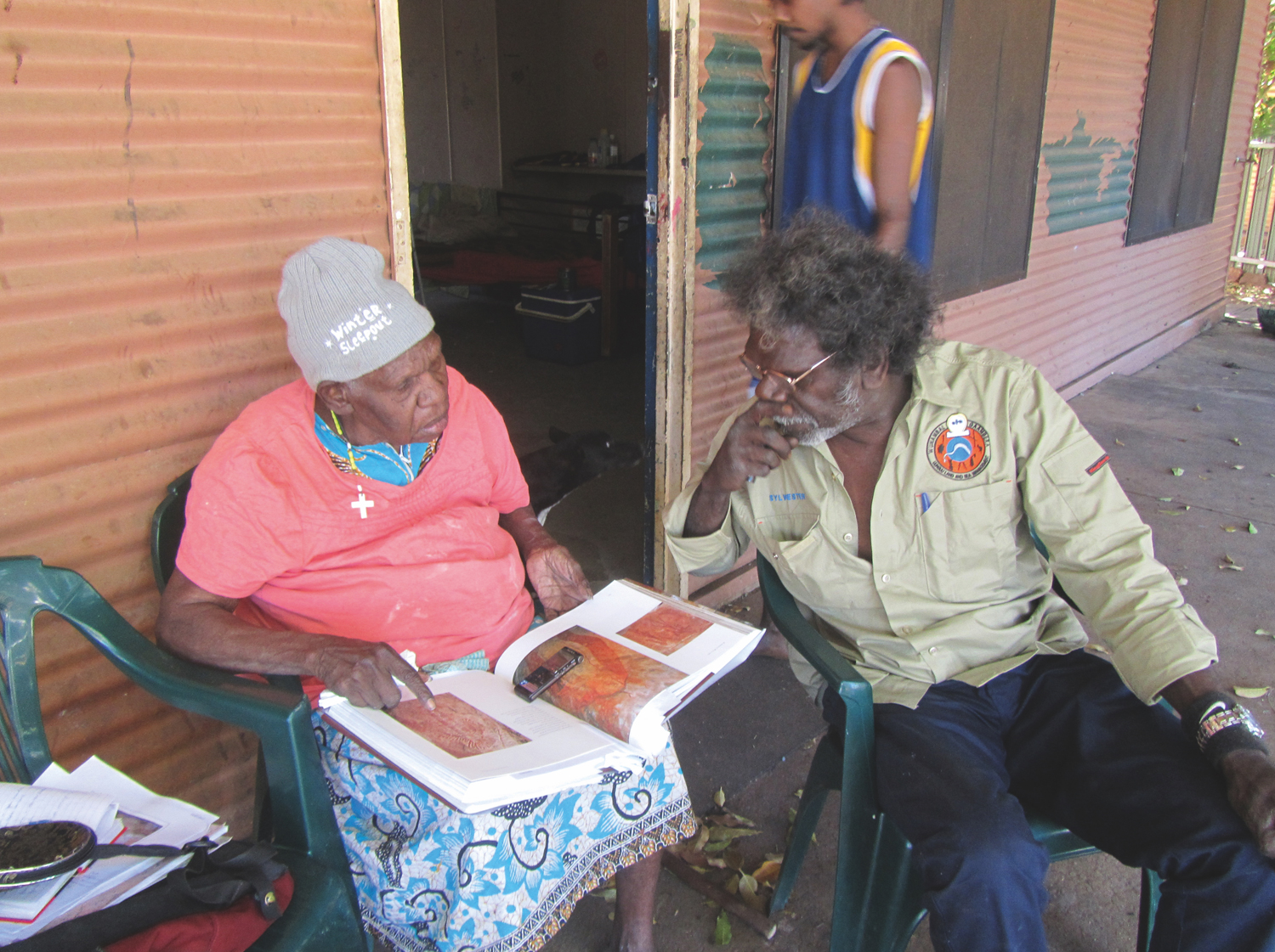 Lily Karadada and her nephew Sylvester reviewing images.