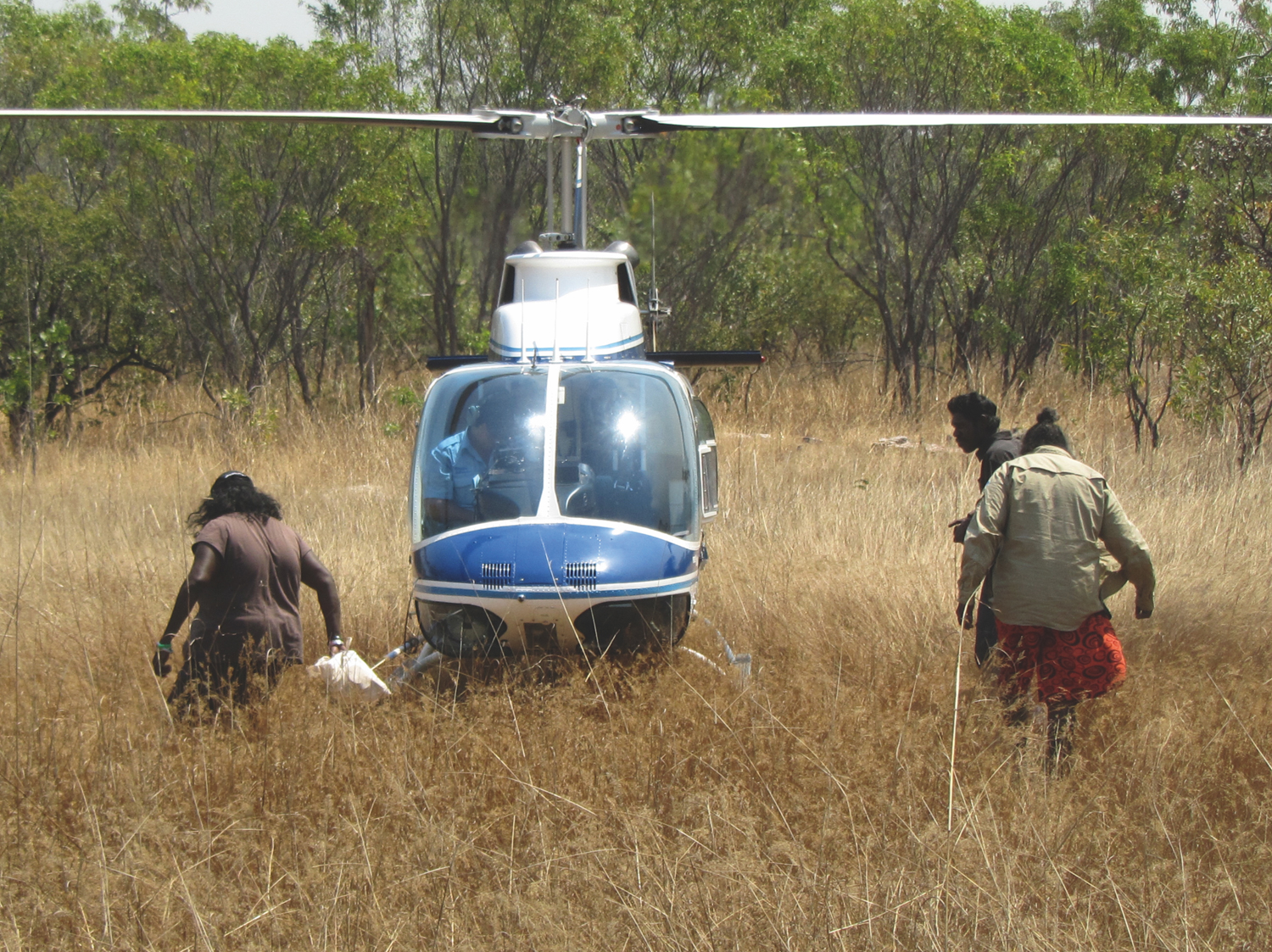 Wunambal Gaambera Traditional Owners Bernadette Waina (left), Dorothy Djanghara (right) and Troy Karadada (behind) returning from visiting an art site.