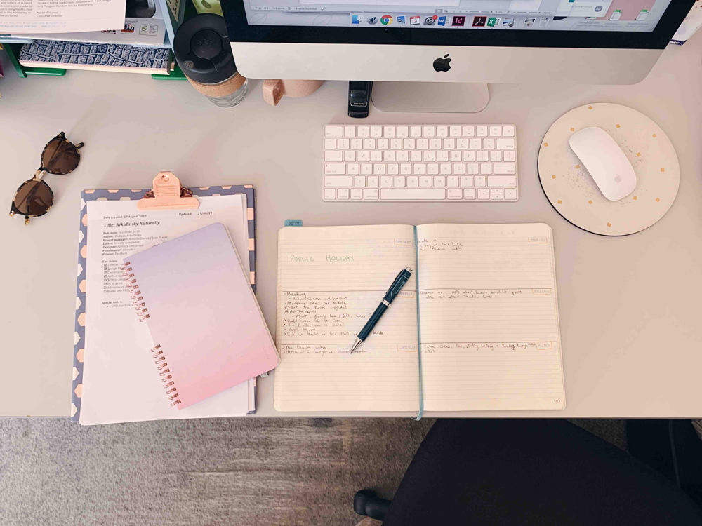 The first thing I do when I get to work is to check my emails and find out if there’s anything that requires my immediate attention. Then I look through my diary, journal and what I call my project hubs to see where I’m at with each book. As an editor, I often have lots of projects underway at one time, so I need many organisational tools to keep track of everything. I review these to see what needs to be chased up, such as cover concepts from a designer, extra materials from an author or proof pages from a proofreader.