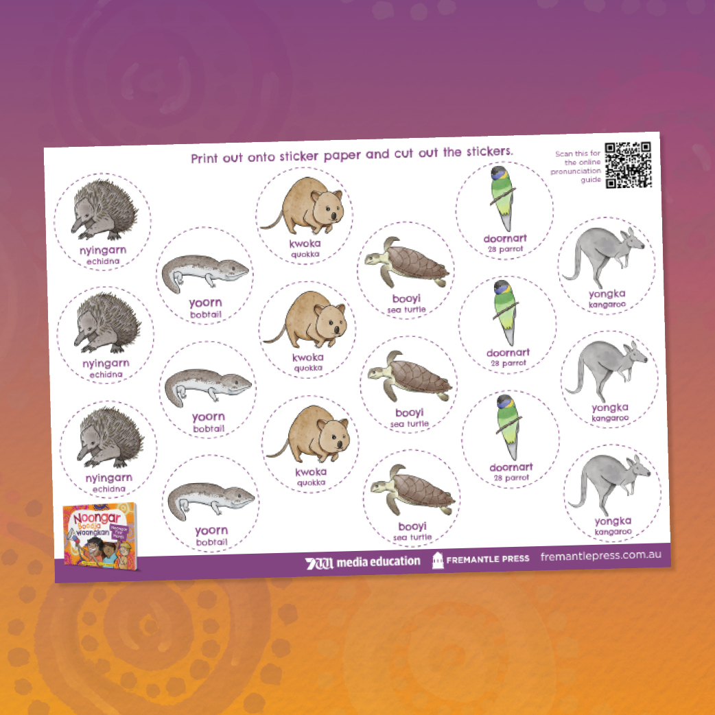 In this activity sheet children will be able to cut out stickers of some of the animals from the book with each sticker containing the Noongar and English word for the animal. To learn to pronounce the words in the activity sheet and in Noongar Boodja Waangkan listen to our audio pronunciation guide.