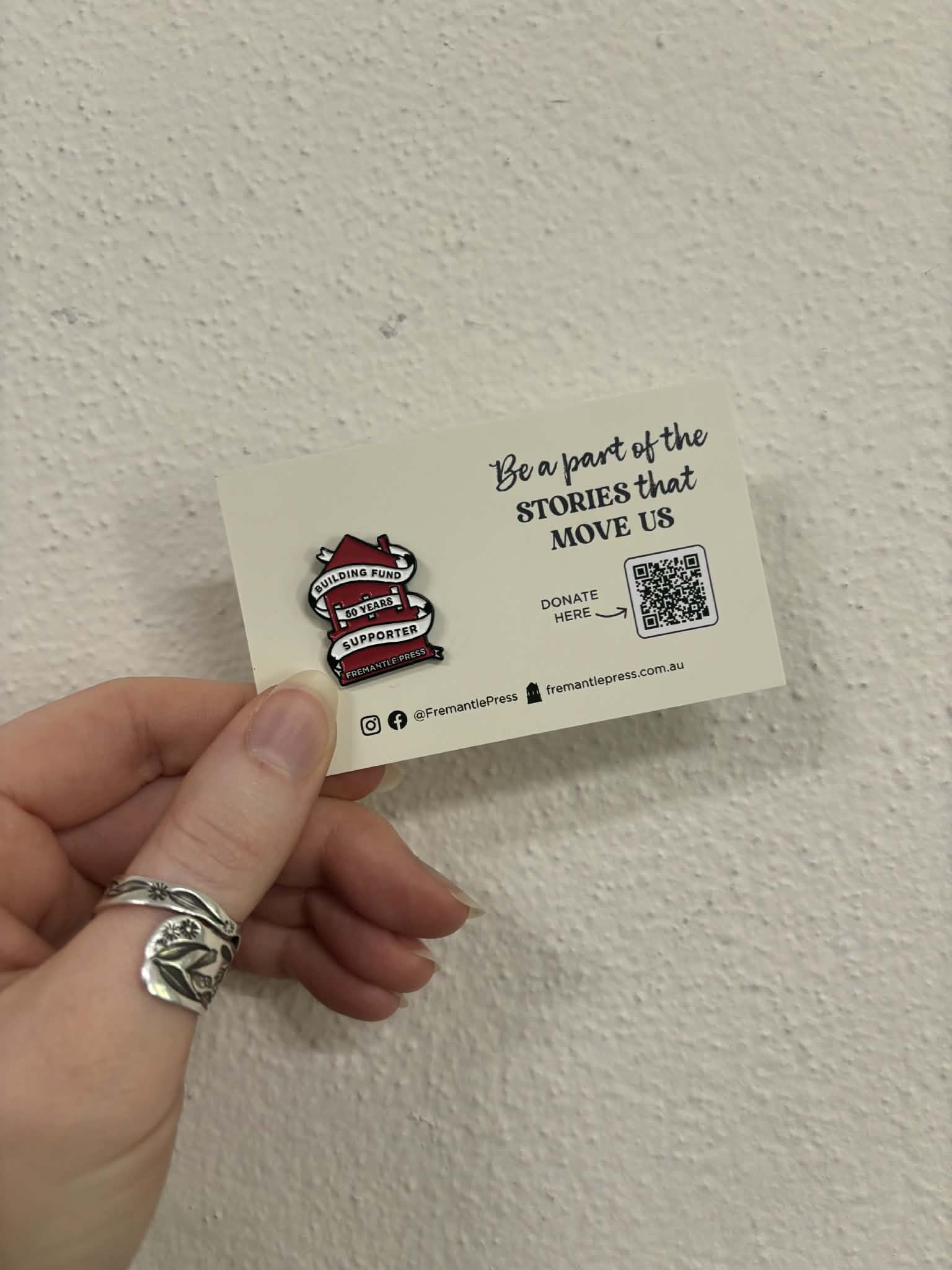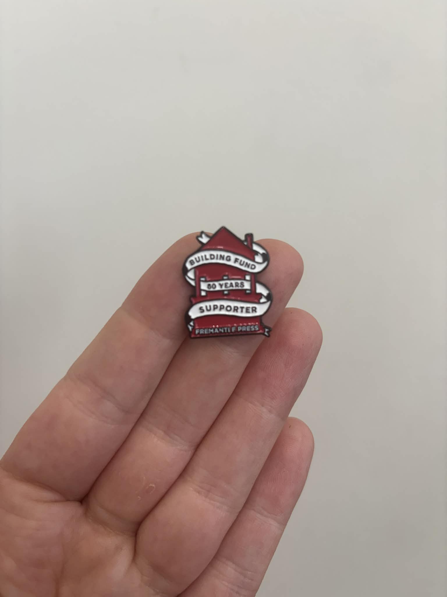 Show your support for the stories that move us with this limited-edition Fremantle Press supporter pin. Made from soft enamel and featuring a ‘Building Fund Supporter’ banner, it is a small statement you can wear anywhere.