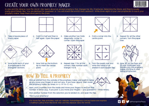 Written by Kathryn Lefroy, Alex and the Alpacas Save the World, has it all a magical prophecy, talking alpacas and evil spirits. Alex must use all her brains, brawn and bravery in order to survive and save her family and friends. The Create Your Own Prophecy Maker activity sheet is a fun way to predict […]