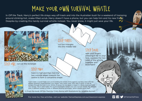 Cristy Burne’s Off The Track is an adventure novel for young readers about the bush, disconnecting from technology, and self-discovery. The Make Your Own Survival Whistle activity sheet incorporates science and visual art to foster active listening, creativity and design skills. For more teaching activities, download the free teaching notes here.