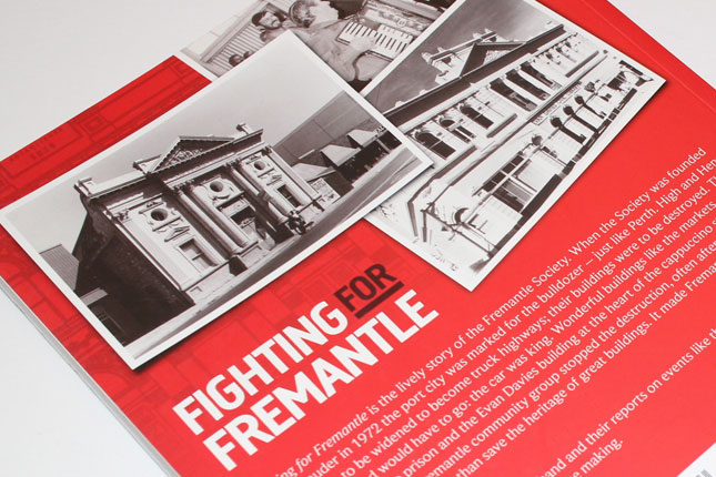 A history of the Fremantle Society created on a tight budget and designed using two colours throughout to give the images and layout maximum appeal.